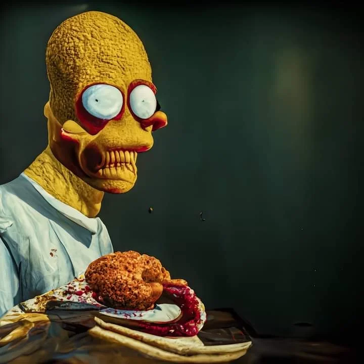 Bottom Image: With his brother’s help Andrew played with some visual AI tools in 2022. The prompt for this one was “Homer Simpson as a deceased Colonel Sanders serving a deep fried chicken donut.”