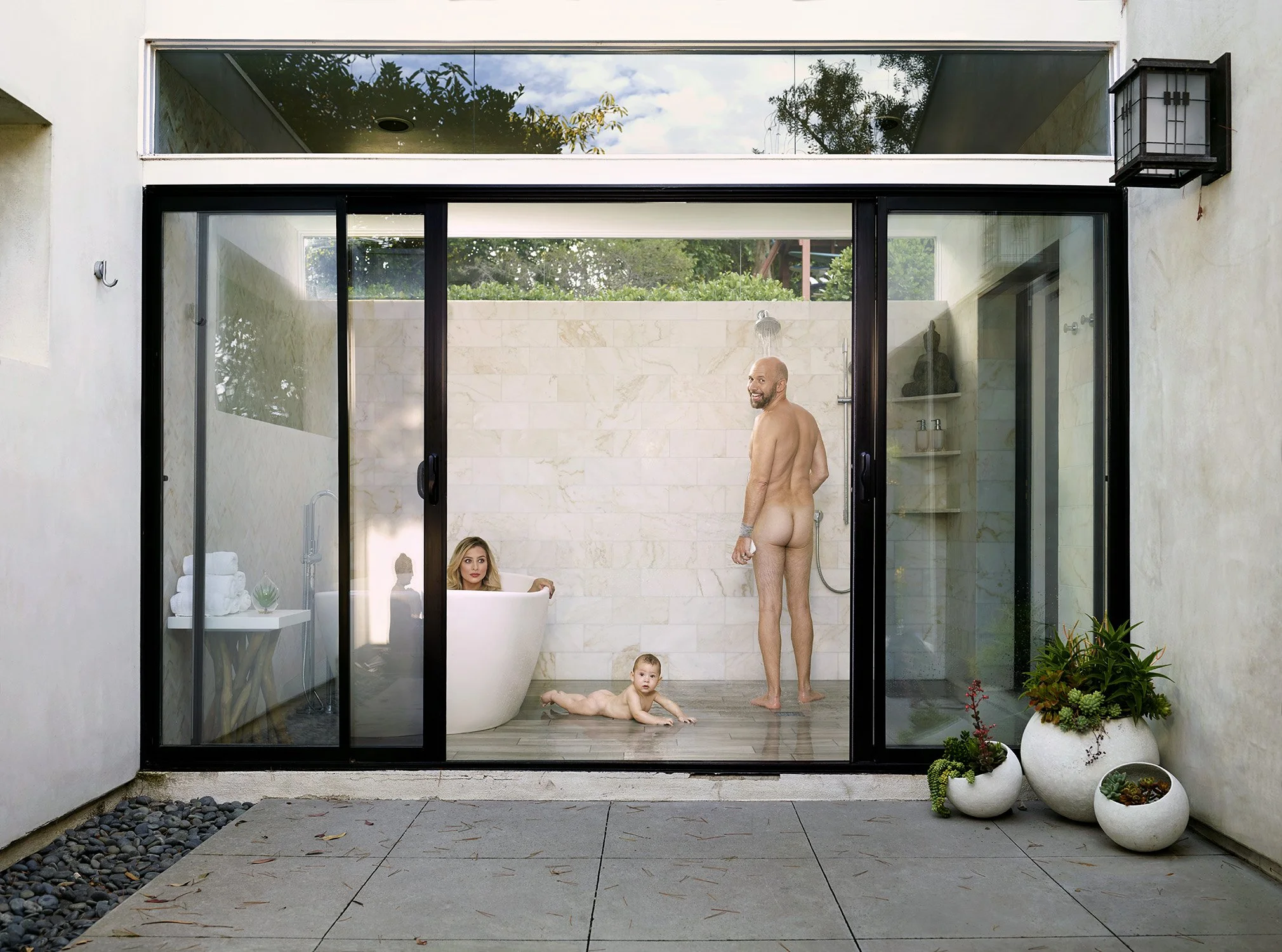 Fourth Image: Neil Strauss, with wife Ingrid De La O, and son Tenn, in their indoor/outdoor bathroom, 2015.