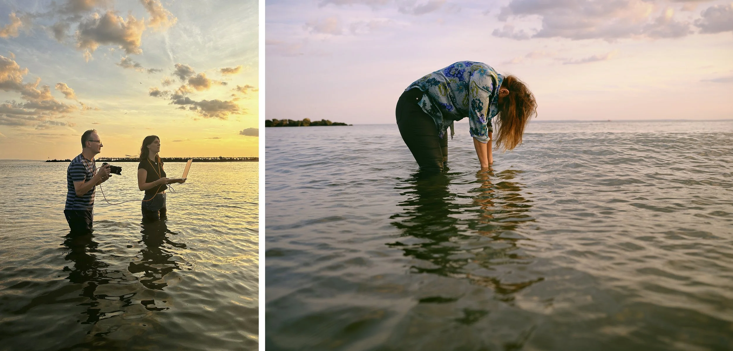Second Image: Left: BTS in the Atlantic Ocean, with intern Jo Lieber. Photo by Sharmeen Chaudhary. Right: In the Atlantic Ocean, off of Coney Island, Brooklyn, NY.