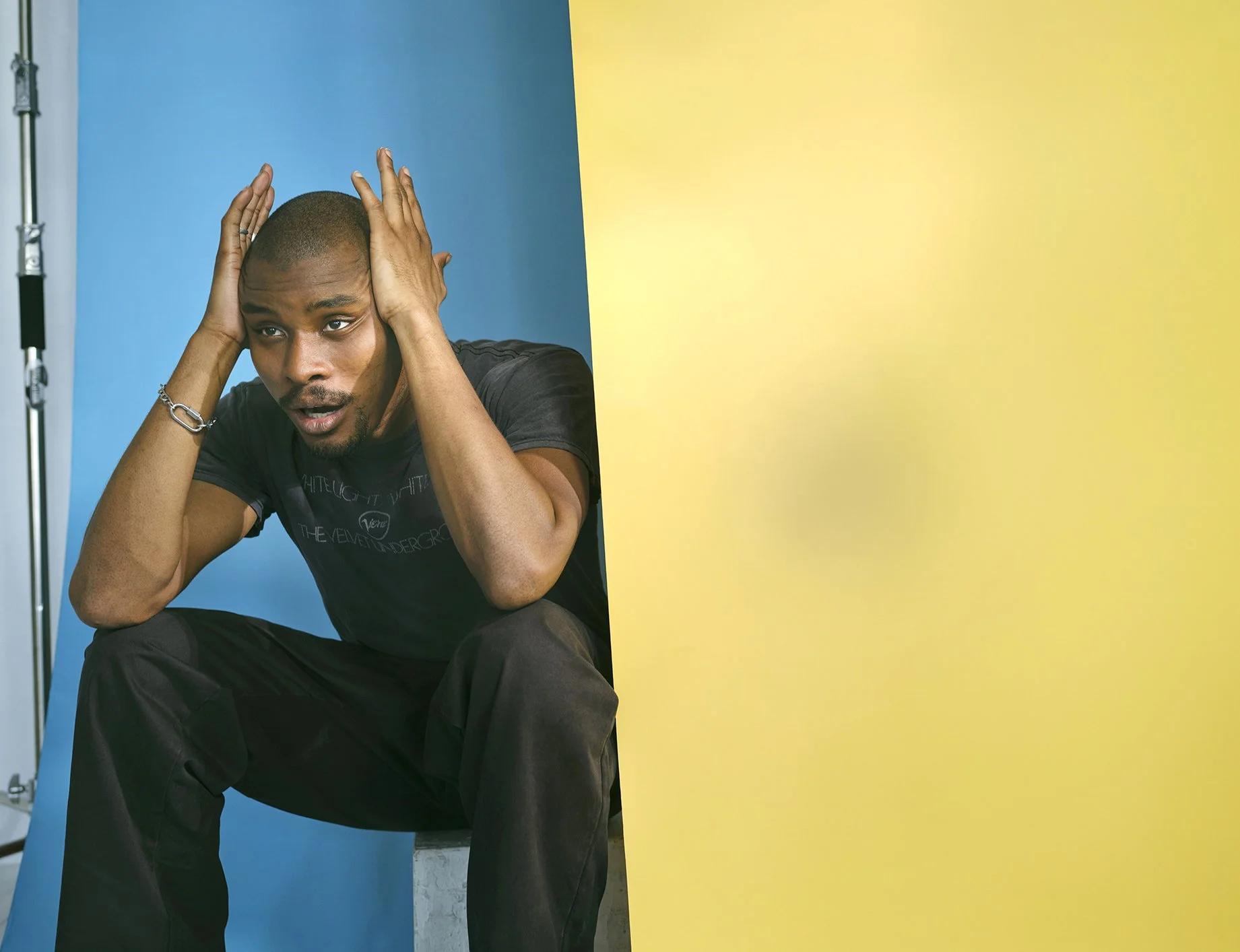 This is where my years of experience pay off, as I remained calm and moved ahead, taking small steps forward. I’d layered yellow seamless over blue for fast transitions, and now I asked Marcus to sit between the two colors on an applebox. He hesitated—but sitting down is a soft ask, and he obliged. And it gave him enough psychological distance to relax and vary his poses.