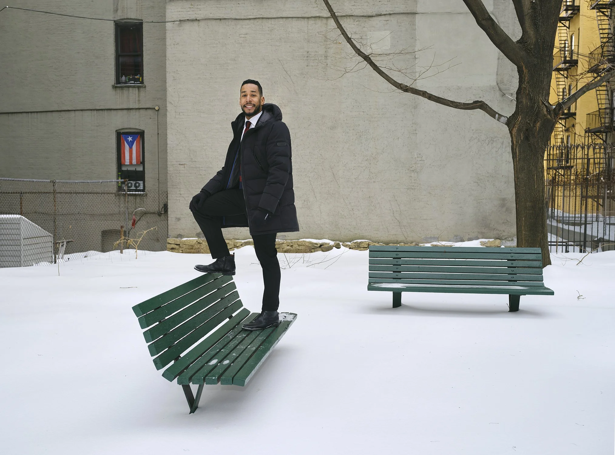 Top Image: In the snow filled courtyard of a Williamsburg apt complex, shot for City and State Magazine.