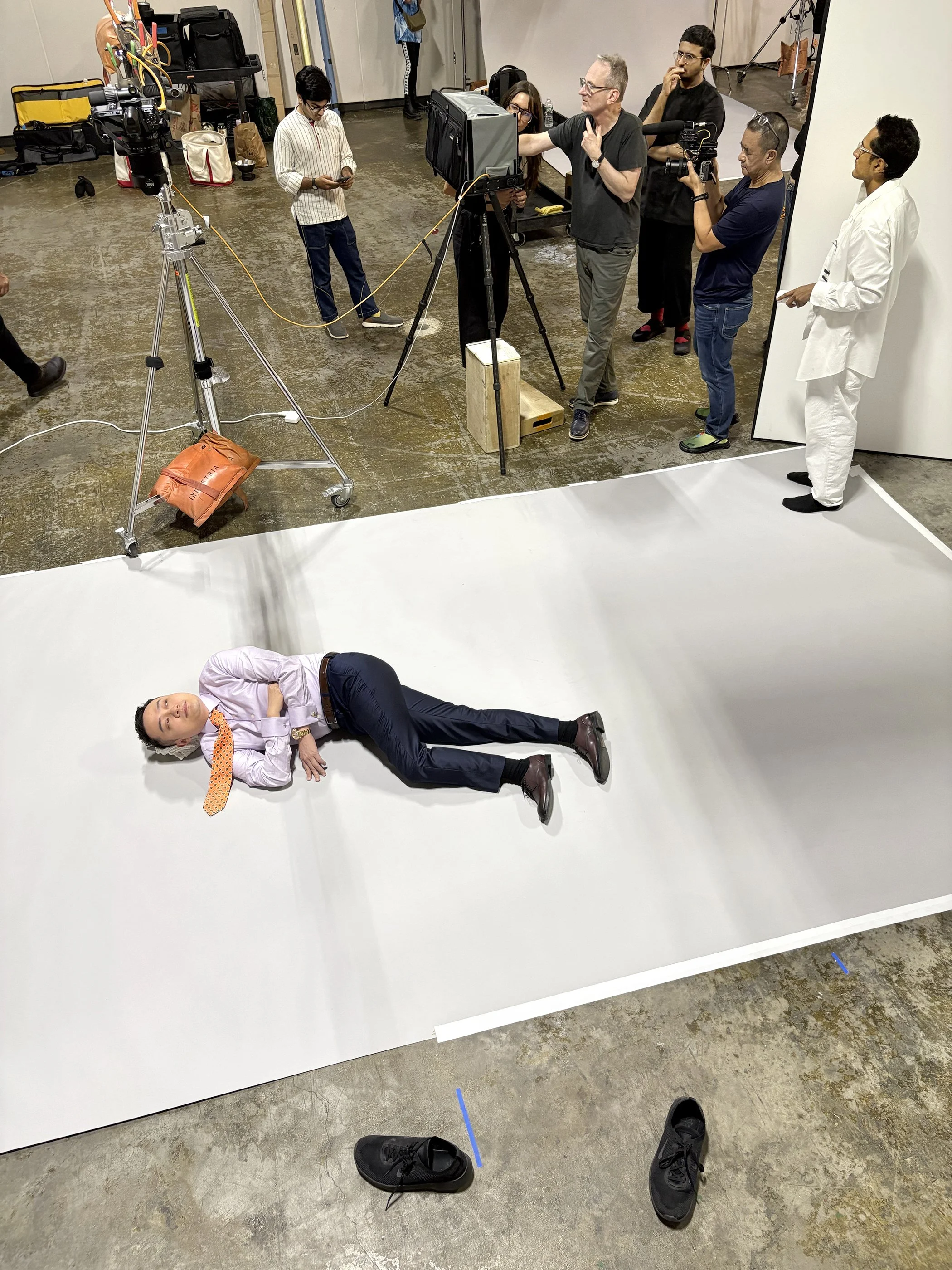 Top Image: Justin Sun lies on our gray seamless, a “magnetized wall,” at Industria Studios in Brooklyn, NY. The camera is boomed over the subject and triggered by the laptop. BTS photo by Jake Parker.