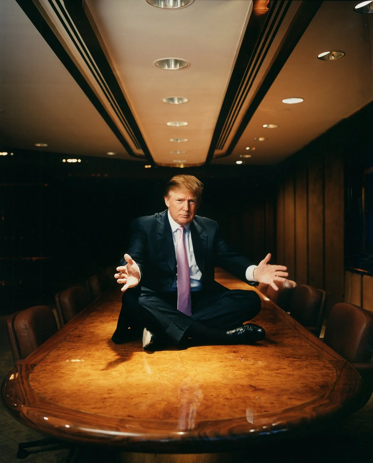 Early in the session, I had him sitting in the middle of the conference table, and looking to break the ice a bit, I mentioned that I had photographed his daughter, Ivanka, the year before. I told him that she was low-key and polite and seemed like a decent person. And then I went the extra step, saying, “It says a lot about the character of a parent when a child exhibits such decency and poise.” Amazingly, it worked, and after that point, he relaxed a little and became more cooperative.